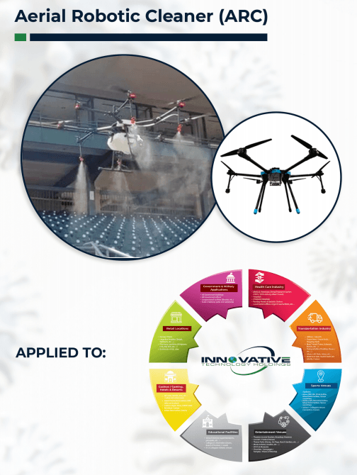 In response to the COVID-19 crisis, Innovative Technology Holdings presents the most efficient Disinfecting Drone. The need for effective and efficient sanitation application methods is greater than ever, and we have a solution for large areas both outdoors and indoor areas.